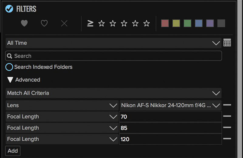 Диалог фильтрации в модуле Browse программы ON1 Photo Raw. Не забудьте поставить галочку напротив Filters и кликнуть на треугольник Advanced. В этой секции можно добавить сколько угодно критериев (в нашем случае достаточно модели объектива и фокусного расстояния). Здесь я ввел три значения ФР для своего 24-120мм объектива.