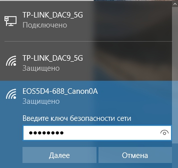 Далее, камера выдаст имя сети, к которой нужно подключить компьютер, и ключ шифрования, который необходимо ввести при подключении.