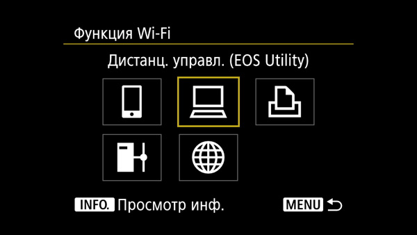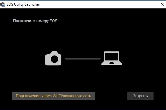 После запуска программы EOS Utility нужно нажать Подключение через Wi-Fi/локальную сеть.