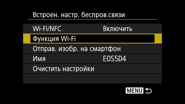 Далее, нужно настроить сеть для соединения с компьютером и получить ключ шифрования. Выбираем Функция Wi-Fi.