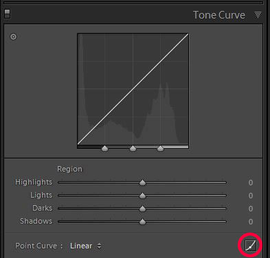 Затем откройте панель Тональной кривой, у которой есть два режима. Если под графиком вы видите слово Регион (Region) с четырьмя слайдерами, кликните по маленькой иконке в нижнем правом углу диалогового окна, чтобы перейти в режим Редактирования точек кривой (Edit Point Curve), как показано на Рисунке 1.