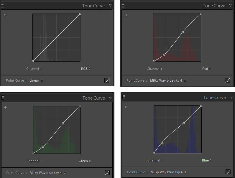 Мое решение этой дилеммы – сместить оттенок неба в сторону синего, сохранив при этом естественный цвет звезд и Млечного пути. Лучший способ, который мне удалось найти – отдельно работать с красным, зеленым и синим каналами на панели Тональной кривой (Tone Curve) Lightroom.