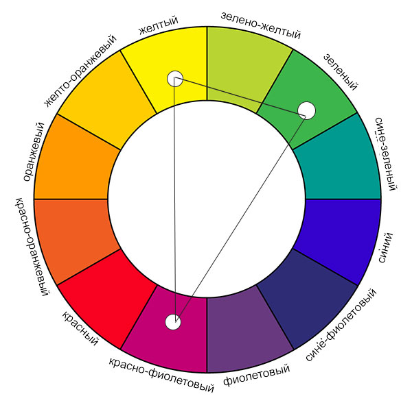 Здесь речь не о цветовых моделях, а о сочетаниях цвета. В живописи как раз три основных краски - это красная, синяя и желтая. Путем их попарного смешения получаются вторичные цвета, фиолетовый, оранжевый и зеленый. Далее - третичные цвета. Почитайте Йоханнес Иттен "Искусство цвета"